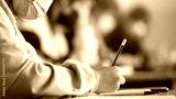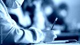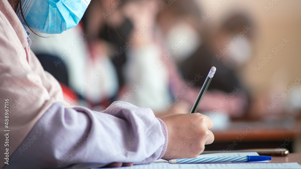 Student taking exam while wearing face mask due to coronavirus emergency. Young woman sitting in class with wearing surgical mask due to Covid-19 pandemic.