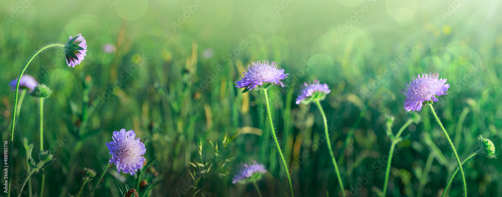 Bloomin Scabiosa caucasica flowers in the sunset.