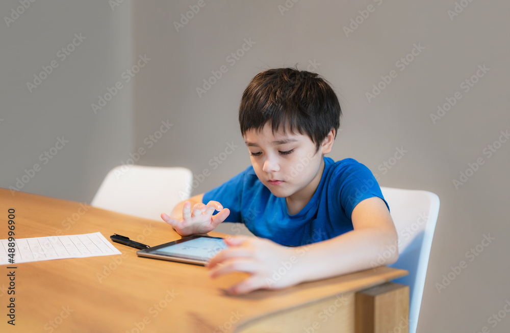 School Kid learning online class room at home, Child using tablet for homework, Young boy studying online video call, E-learning or Homeschooling education concept