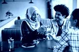 Happy multiracial group of friends toast while celebrating their friendship in cafe.