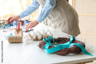 Easter wreath with ribbon, eggs, twine rope and glass with brushes on table