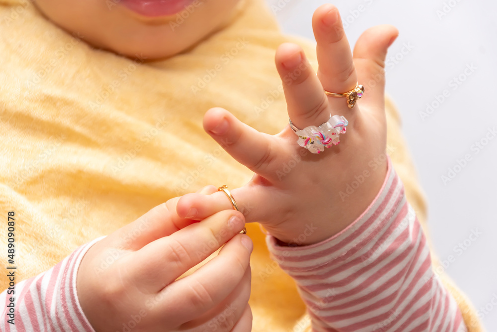 A little girl puts toy rings on her fingers, children's jewelry and bijouterie.