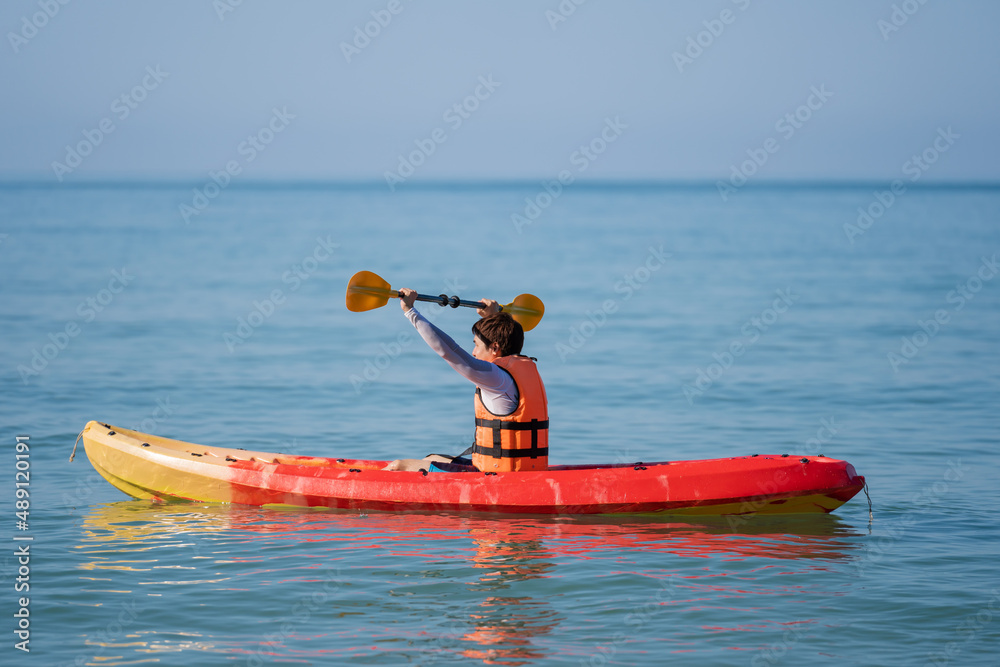 man in life jacket paddling a kayak boat in sea