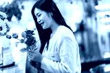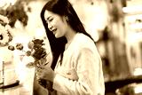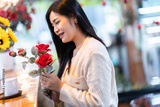 valentine's day,Portrait Happy Smiling beautiful Asian young woman wearing warm clothes holding bouquet of red roses with rose vase of in the living room inside or cafe