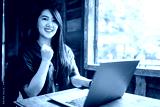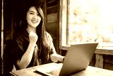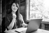 Happy successful business of asian freelance people business female expressed confidence embolden working with laptop computer sitting with coffee cup beside the window of a wooden house background