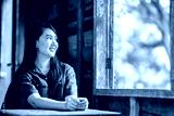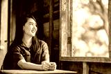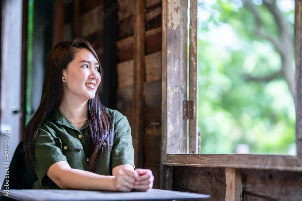 Happy of Portrait Happy Smiling beautiful Asian woman wearing brownish green dress stylish hipster with beside the window of a wooden house background