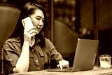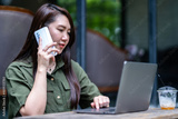 Happy of asian freelance people business female hold pick up smartphone casual working with laptop computer with coffee cup and smartphone in coffee shop like the background,communication concept
