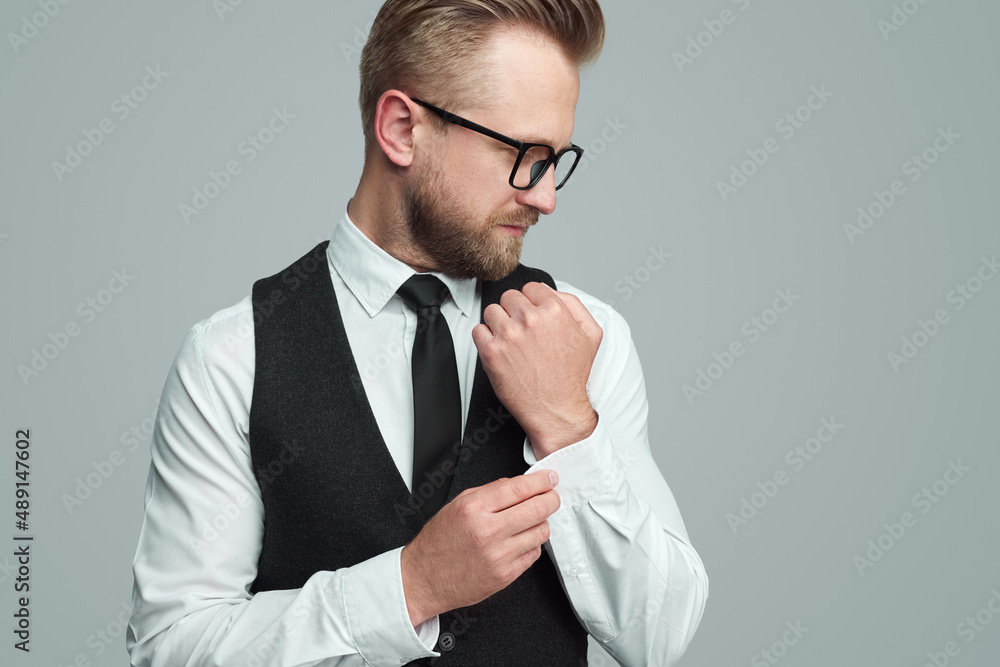 Bearded businessman fastening shirt sleeve