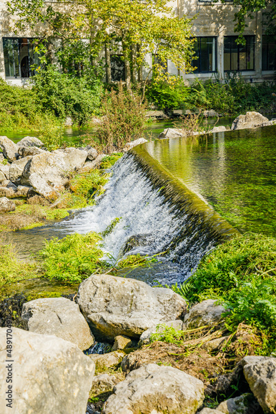 Waters of the Sorgue river streaming in the village of Fontaine de Vaucluse in Provence, France