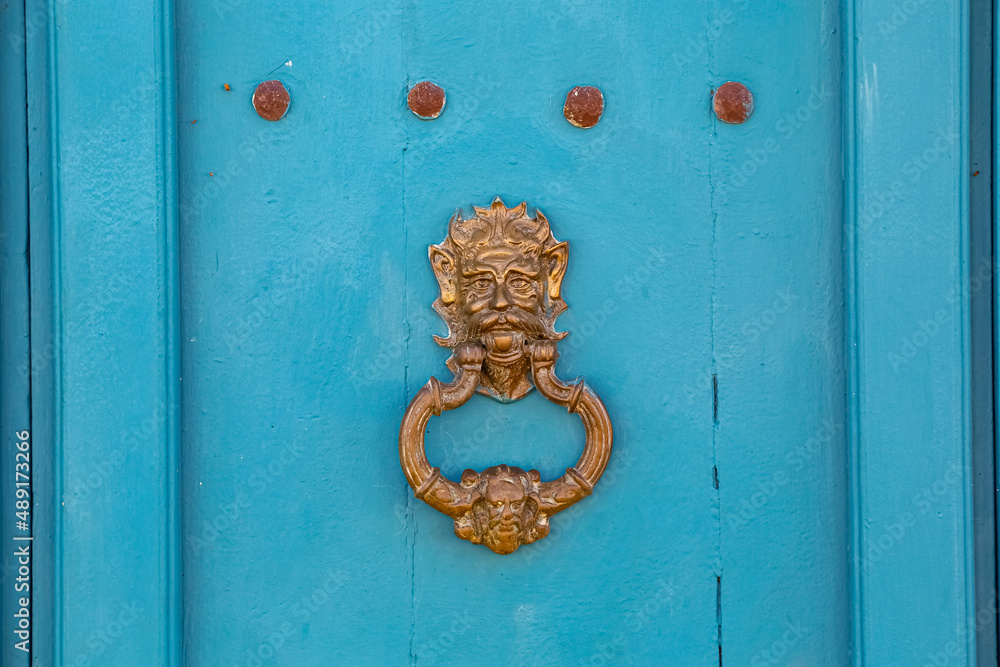 Historic metal door knocker on a turquoise door in, Barichara, Colombia