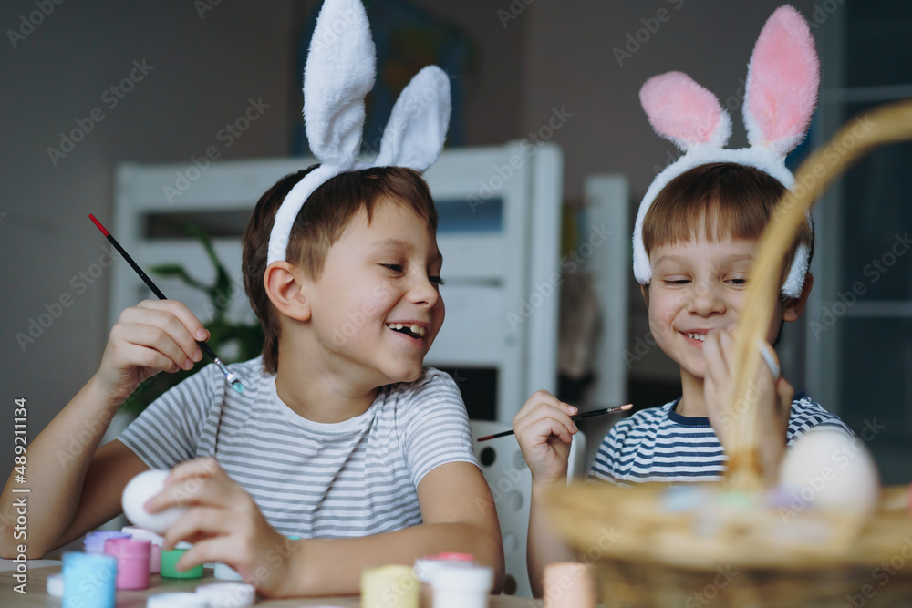 Cute little boys colouring eggs for easter