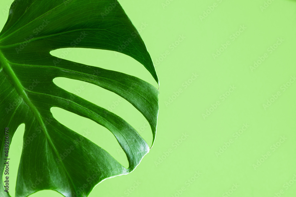 Green leaves of monstera on colored pastel background. Trendy tropical plant