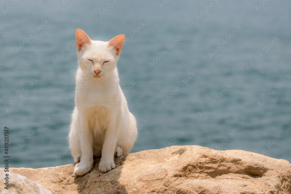 Closeup of a white kitten standing on the rock lit by sunlight against the sea