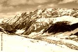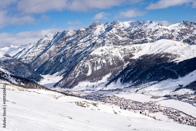 Scenic view of Livigno village in Sondrio province, Italy. Popular skiing resort in European Alps. Snowcapped mountains, houses and ski slopes