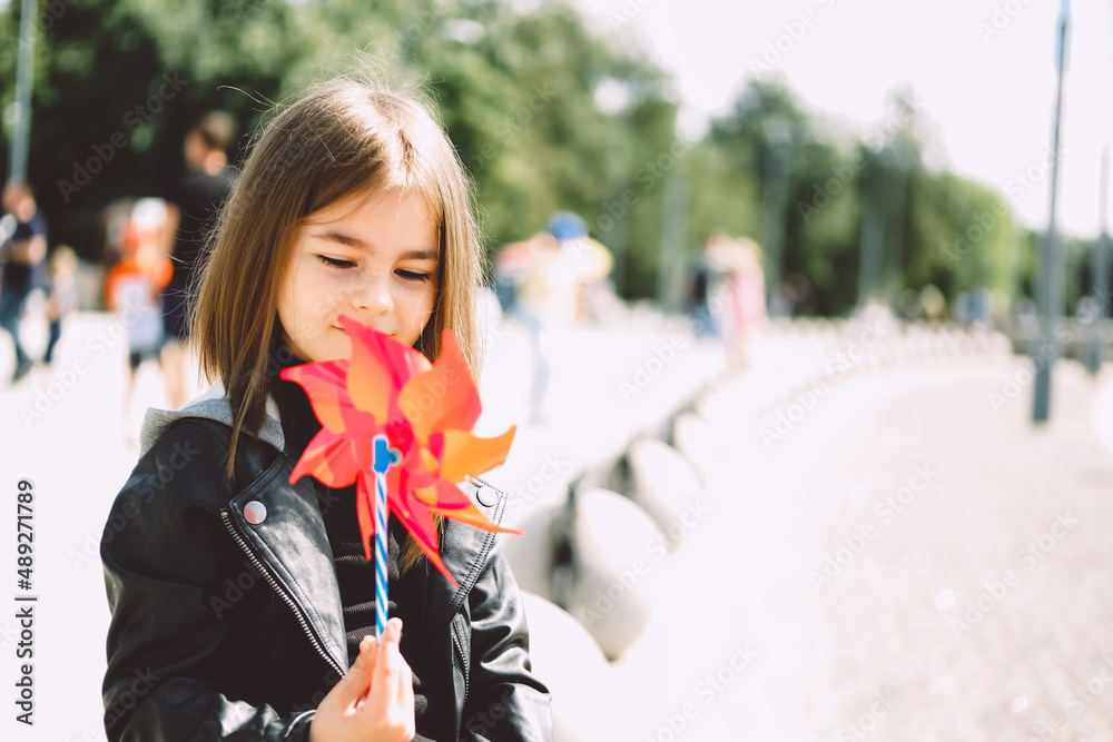 Happy girl with red pinwheel walking outdoors.