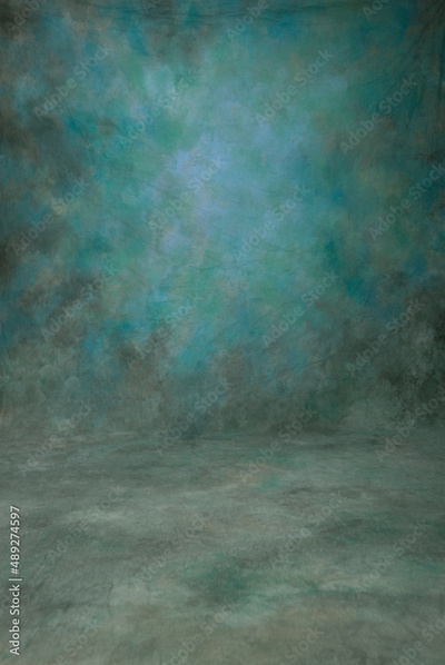 Dreamy and romantic aqua shades of blue and green, traditional painted canvas or muslin fabric cloth studio backdrop or background, suitable for use with portraits and products alike.