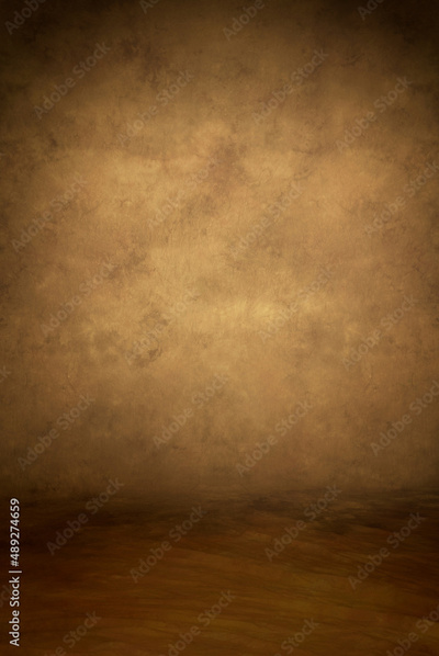 Painted canvas or muslin fabric cloth studio backdrop or background, suitable for use with portraits, products and concepts. Warm brown colors, with floor area included for full-length portraiture.