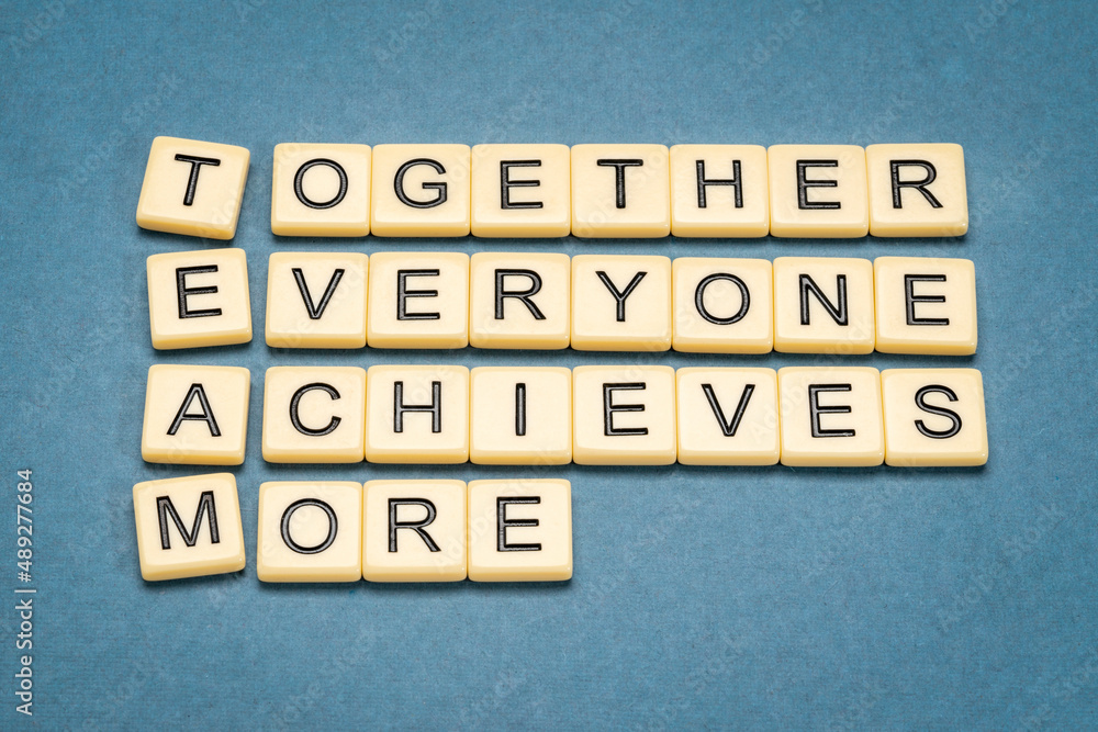 TEAM acronym (together everyone achieves more), teamwork motivation concept, word abstract in ivory letter tiles against textured handmade paper, business and education concept