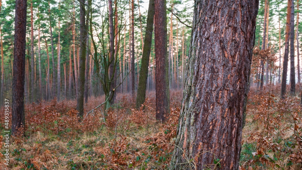 Drzewa w lesie w słoneczny dzień o poranku i wschodzi słońca