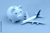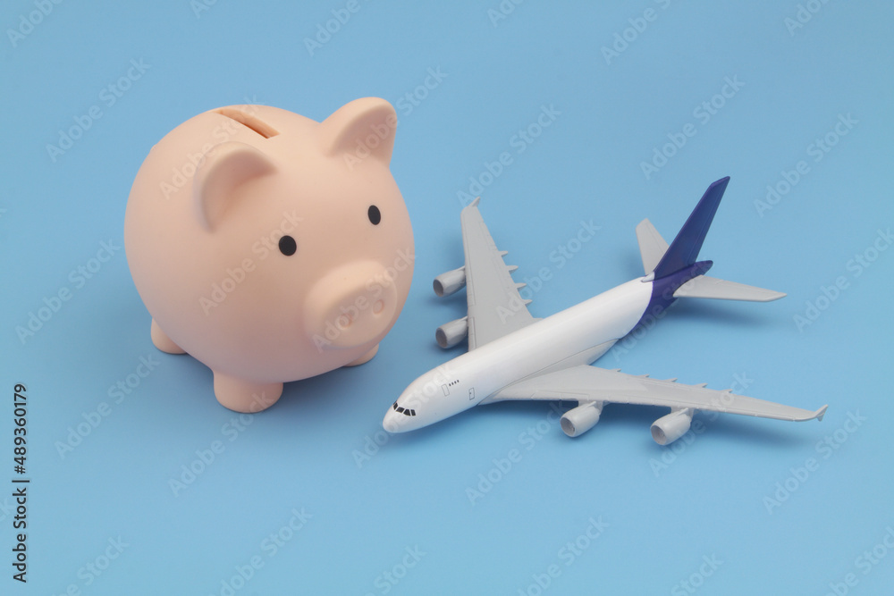 Airplane tickets price and save money concept. Airplane model and piggy bank on blue background.