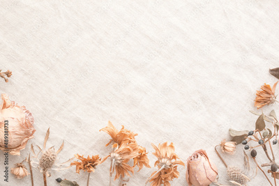 ビンテージ風バラなどのドライフラワーのフレームと布の背景