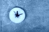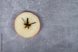 Clock with juicy apple hands, fruit apple clock shows the time on a gray background