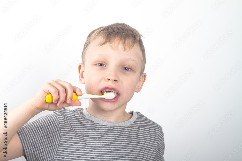 A Caucasian boy in a gray T-shirt brushes his teeth with a black charcoal toothpaste