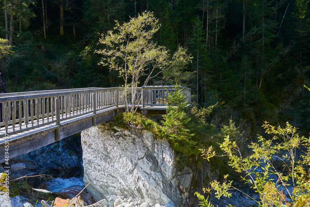Holzbrücke über den Bergbach, im Habachtal. Oberhalb von Bramberg und Neukirchen, in Österreich.