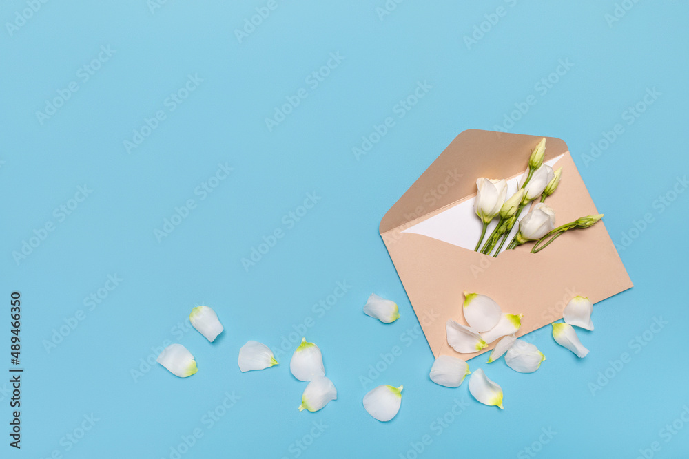 Flower bud flat lay in an envelope lisianthus or eustoma, on pastel blue background with copy space. Concept for greeting card and mail.