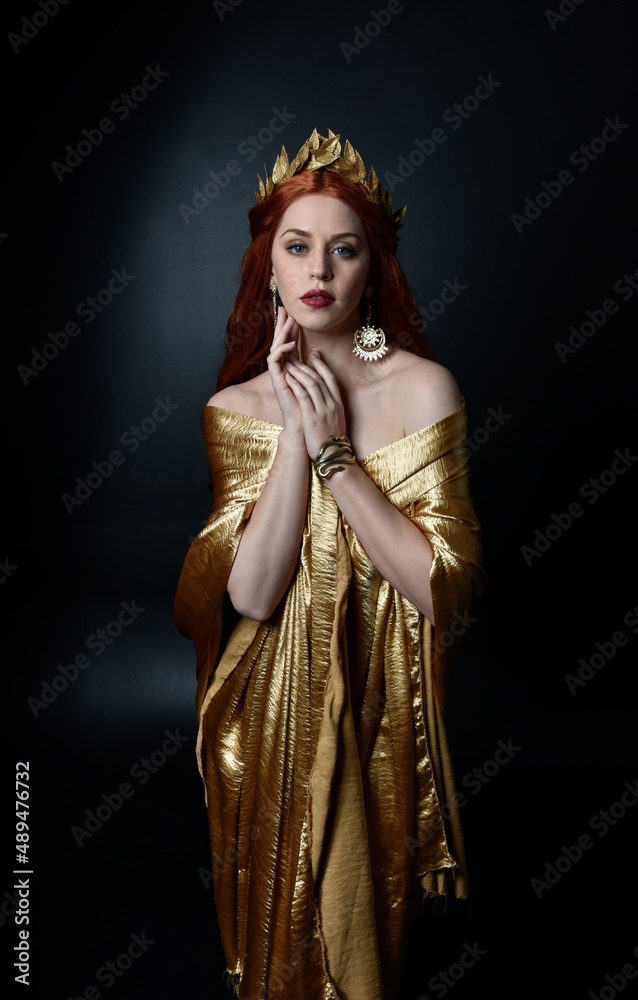 Full length portrait of pretty female model wearing grecian goddess toga gown, posing with elegant gestural movements on a studio background.