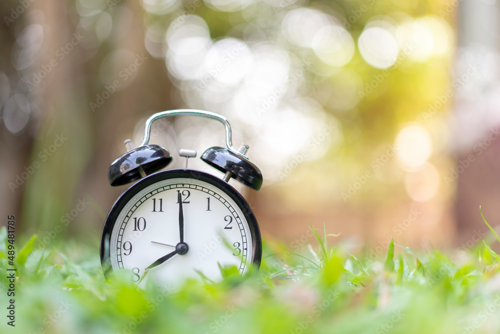 Close up of clock alarm on the green background