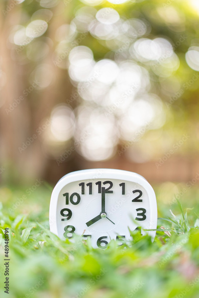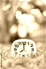 Close up of clock alarm on the green background