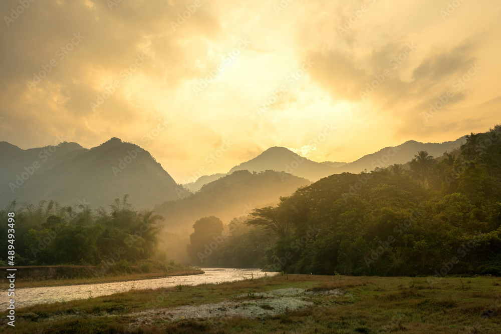 Breath-taking summer sunrise view over the mountains with beautiful lake, Kerala nature scenery image for travel and tourism concept