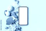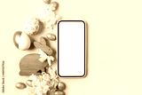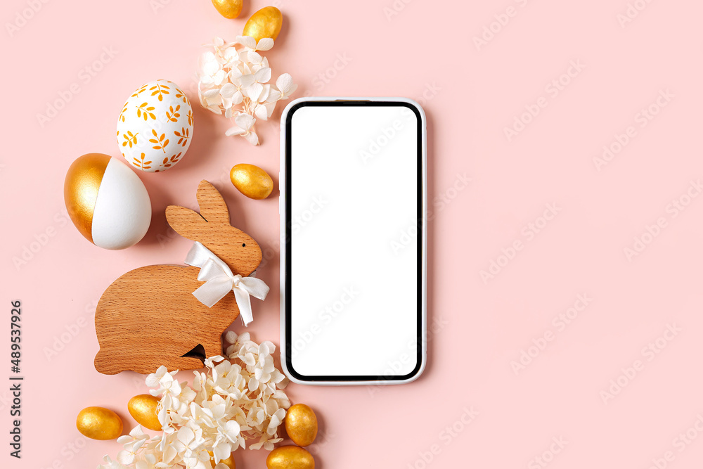Smartphone mockup with Easter golden eggs, candy and flowers on pastel pink background. Holiday concept. Happy Easter