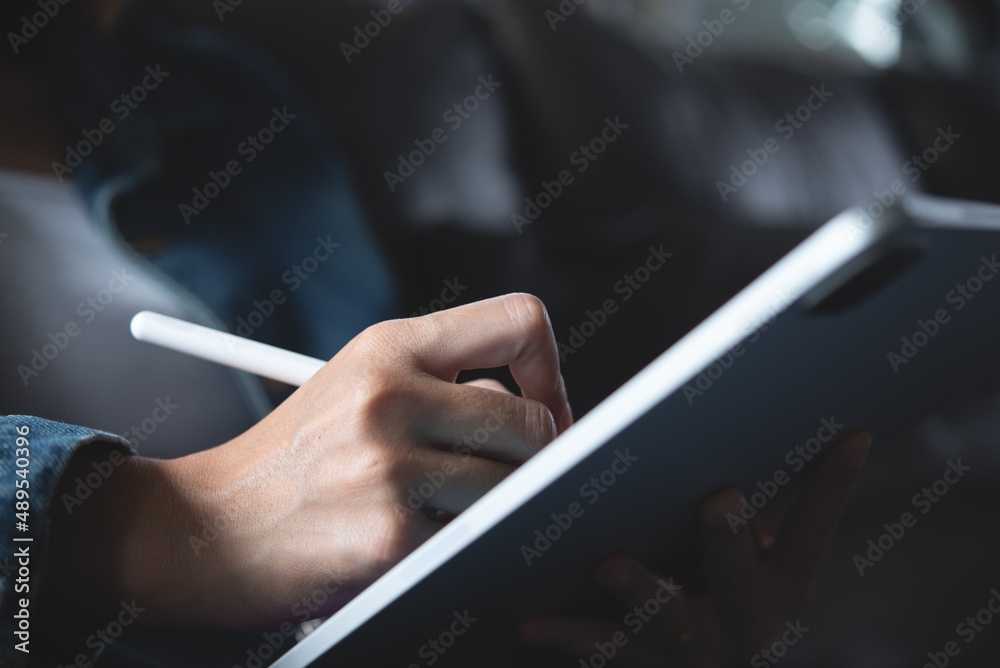 Close up of woman hand using stylus pen writing or drawing on digital tablet via mobile app during working at home