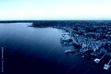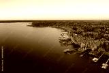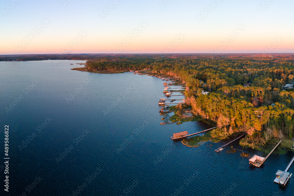 Panoramic aerial photograph of Lake Mary Jane, Orlando Florida. In the distance is the Stanton energy center.