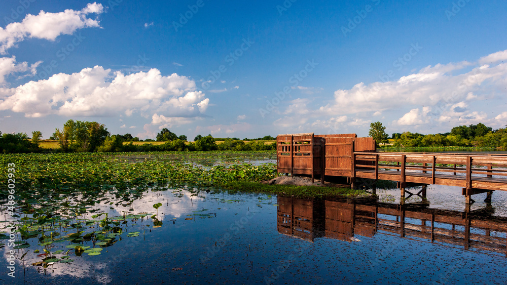 Wetlands landscape with a bird blind and cloudy sky reflected in a lake at the August A. Busch Memorial Conservation Area in St. Charles County Missouri