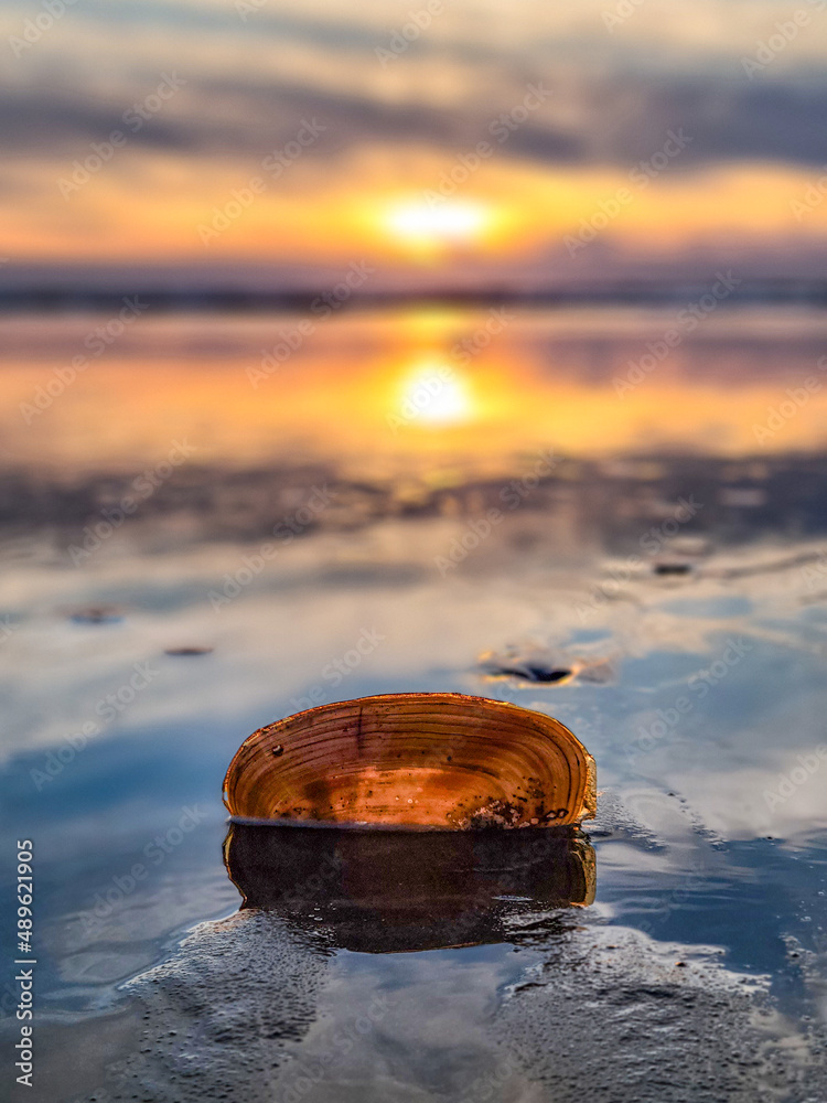 A razorclam shell is lit by the setting sun on a beach with reflective sand