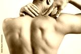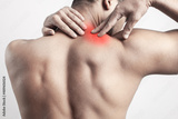 trapezius muscle pain, muscular man showing injury pan in shoulder muscle or levator muscle