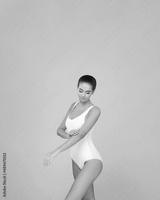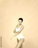Slender and healthy girl in a white swimsuit or underwear. Young woman with perfect skin. Body care, weight loss, fitness and dieting.