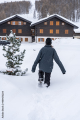 Rear view of teenage girl walking in fresh knee deep snow. Heading home concept