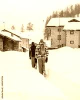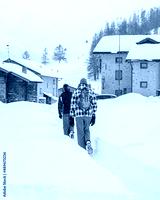 Rear view of two adult men walking home in fresh knee deep snow