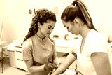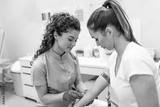 Preparation for blood test with pretty young woman by female doctor medical uniform on the table in white bright room. Nurse pierces the patient's arm vein with needle blank tube.
