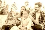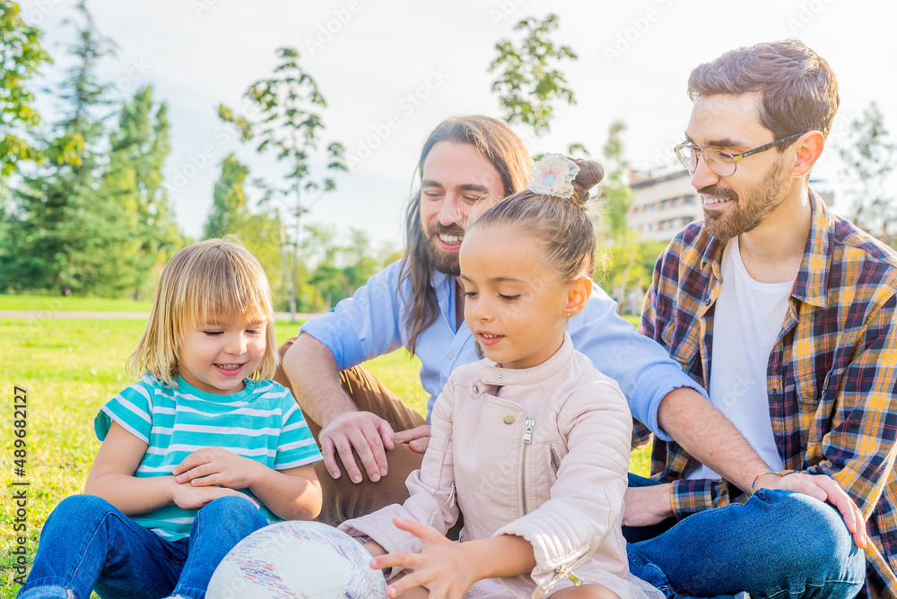gay male couple with their children sitting on the grass