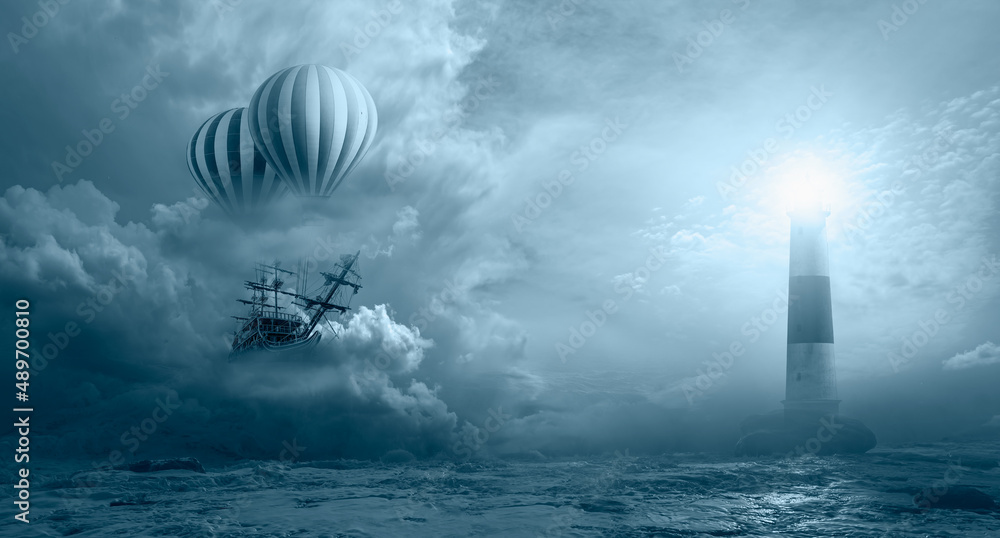 Fantasy background hot air balloon with old ship flying over stormy clouds lighthouse in the foreground