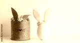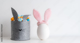 Easter minimalistic decor in the interior. A gray felt basket in the shape of a hare and a large ceramic egg with ears