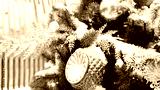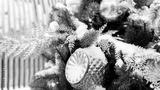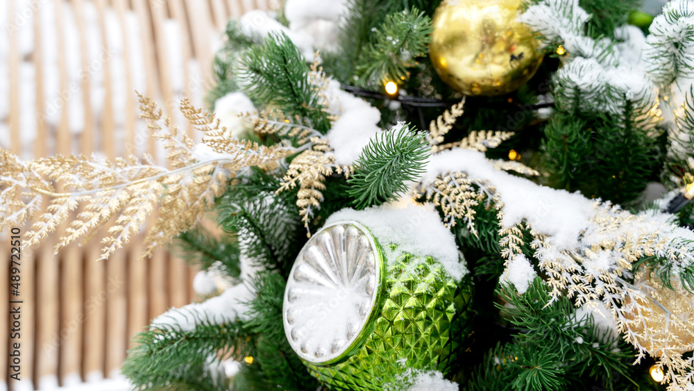 Decorated Christmas tree. Close-up of branches and decorative elements. Christmas green background.