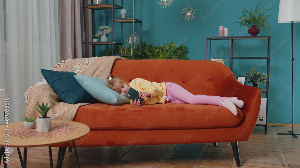Tired little school kid girl using mobile phone technology device lying on sofa alone at home. Child toddler hold smartphone watching online cartoons, chatting with friends. Children tech addiction