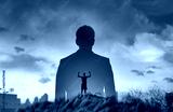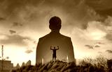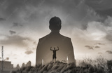 Silhouette of strong young man feeling determined, empowered and motivated putting fist up to the sky facing the city. People power and inner strength concept