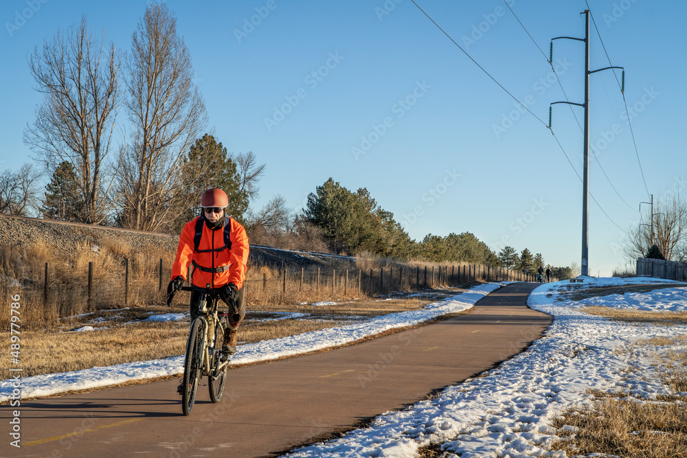 senior male cyclist is riding a touring bike in winter scenery in Fort Collins, Colorado - Power Trail runs along railroad and power line